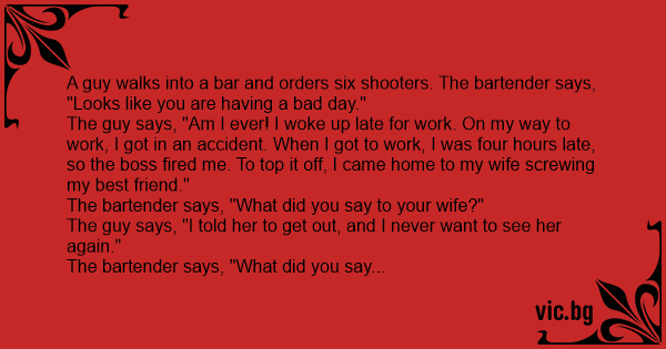 Een man zit aan de bar en slaat aan de lopende band glazen whisky achterover. De barman, enigszins bezorgd, vraagt of alles goed is. "Nee, het gaat niet goed. Ik heb zojuist mijn vrouw en mijn...