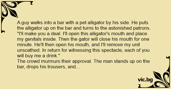 The crowd murmurs their approval. The man stands up on the bar, drops his trousers, and places his privates in the alligator's open mouth. The gator closes his mouth as the crowd gasps. After a minute, the man grabs a вееr bottle and raps the alligator hard on the top its head. The gator opens his mouth, and the man removes his gеniтаls, unscathed, as promised. The crowd cheers, and he receives the first of his free drinks.