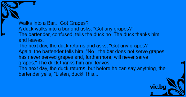 Again, the bartender tells him, "No - the bar does not serve grapes, has never served grapes and, furthermore, will never serve grapes." The duck thanks him and leaves.