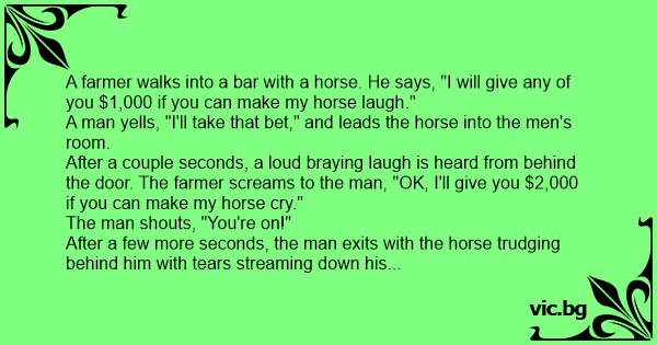 After a couple seconds, a loud braying laugh is heard from behind the door. The farmer screams to the man, "OK, I'll give you $2,000 if you can make my horse cry."