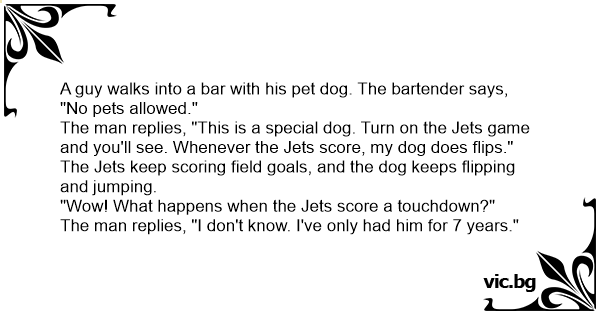 The man replies, "This is a special dog. Turn on the Jets game and you'll see. Whenever the Jets score, my dog does flips."