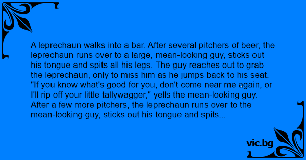 A leprechaun walks into a bar. After several pitchers of вееr, the leprechaun runs over to a large, mean-looking guy, sticks out his tongue and spits all his legs. The guy reaches out to grab the leprechaun, only to miss him as he jumps back to his seat.