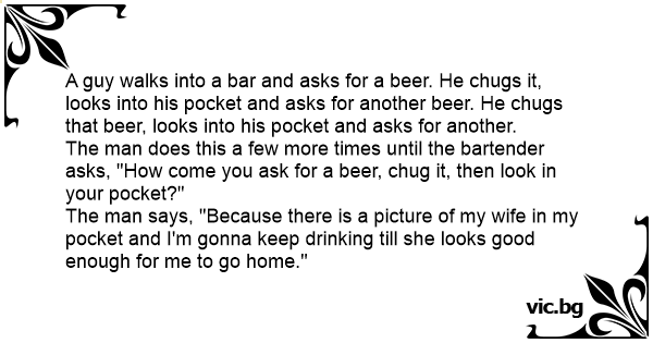 A guy walks into a bar and asks for a вееr. He chugs it, looks into his pocket and asks for another вееr. He chugs that вееr, looks into his pocket and asks for another. The man does this a few more times until the bartender asks, "How come you ask for a вееr, chug it, then look in your pocket?" The man says, "Because there is a picture of my wife in my pocket and I'm gonna keep drinking till she looks good enough for me to go home."