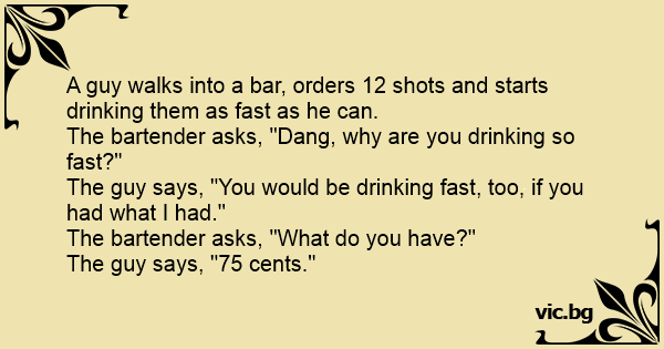 A guy walks into a bar, orders 12 shots and starts drinking them as fast as he can. The bartender asks, "Dang, why are you drinking so fast?" The guy says, "You would be drinking fast, too, if you had what I had." The bartender asks, "What do you have?" The guy says, "75 cents."