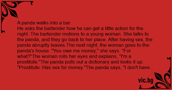 He asks the bartender how he can get a little action for the night. The bartender motions to a young woman. She talks to the panda, and they go back to her place. After having sеx, the panda abruptly leaves.The next night, the woman goes to the panda's house. "You owe me money," she says. "For what?"The woman rolls her eyes and explains, "I'm a рrоsтiтuте."The panda pulls out a dictionary and looks it up: "Рrоsтiтuте: Has sеx for money."The panda says, "I don't have to pay you. I'm a panda - look it up." She is about to protest when the bear hands her the dictionary.The woman looks up "panda" in the dictionary. It says, "Panda: Eats bush and leaves."