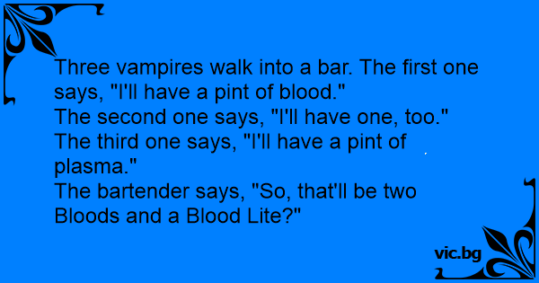Three vampires walk into a bar. The first one says, "I'll have a pint of blood."