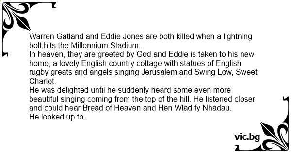 He looked up to see a great palace with statues of Barry John and Gareth Edwards and a party in the garden had Brains SA flowing freely as the crowd watched Scott Gibbs scoring his try against England in 1999. He went to the Lord and said: “I don’t want to appear ungrateful - but why does Warren get the huge mansion?”