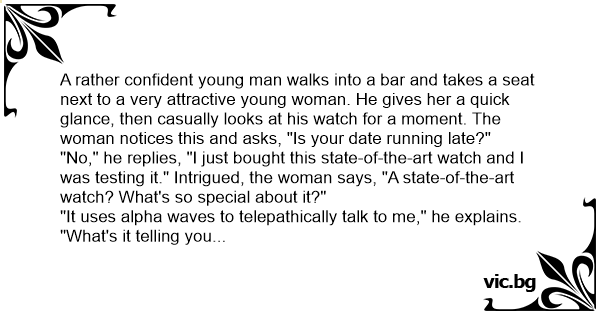 En kille slår sig ner bredvid en snygg tjej vid baren. Han börjar pilla på sin klocka. - Är din dejt försenad, frågar tjejen. - Nej, svarar han, det här är en specialklocka som skickar information....