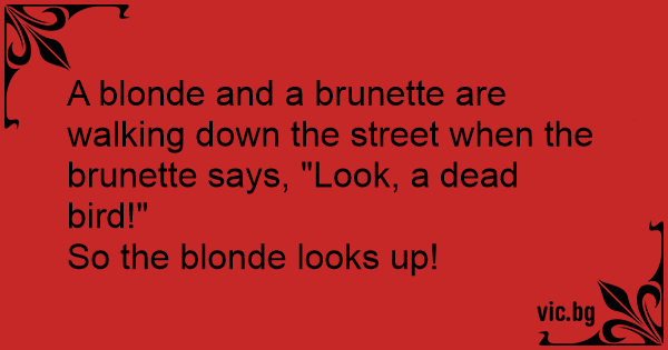 Op straat loopt een dom blondje en een brunette. De brunette roept: “Kijk een dood vogeltje!” Waarop het domme blondje omhoog kijkt en zegt: “Waar dan?”