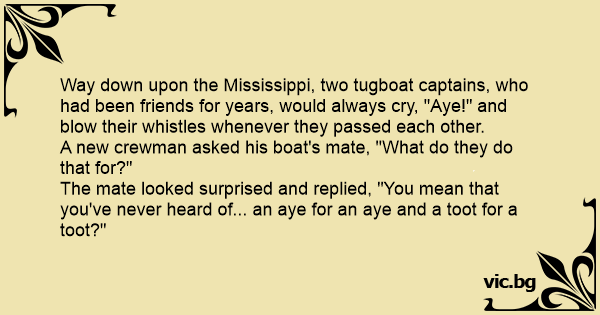Way down upon the Mississippi, two tugboat captains, who had been friends for years, would always cry, "Aye!" and вlоw their whistles whenever they passed each other.