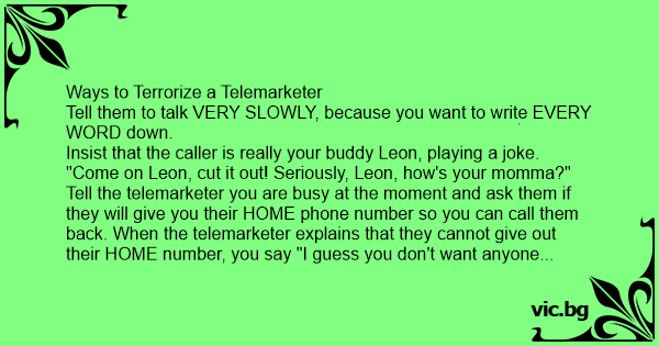Ways to Terrorize a Telemarketer Tell them to talk VERY SLOWLY, because you want to write EVERY WORD down. Insist that the caller is really your buddy Leon, playing a joke. "Come on Leon, cut it out! Seriously, Leon, how's your momma?" Tell the telemarketer you are busy at the moment and ask them if they will give you their HOME phone number so you can call them back. When the telemarketer explains that they cannot give out their HOME number, you say "I guess you don't want anyone bothering you at home, right?" The telemarketer will agree and you say, "Now you know how I feel!" After the telemarketer gives their spiel, ask him/her to marry you. When they get all flustered, tell them that you could not just give your credit card number to a complete stranger. Tell the telemarketer you are on "home incarceration" and ask if they could bring you a case of вееr and some сhiрs. If they want to loan you money, tell them you just filed for bankruptcy and you could sure use some money. If MCI calls trying to get you to sign up for the Family and Friends plan, reply, in as SINISTER a voice as you can, "I don't have any friends... would you be my friend?" Cry out in surprise, "Judy! Is that you? Oh my God! Judy, how have you been?" Hopefully, this will give Judy a few brief moments of pause as she tries to figure out where the hеll she could know you from. If they say they're John Doe from XYZ Company, ask them to spell their name. Then ask them to spell the company name. Then ask them where it is located. Continue asking them personal questions or questions about their company for as long as necessary. When they ask "How are you today?" Tell them! "I'm so glad you asked because no one these days seems to care, and I have all these problems; my arthritis is acting up, my eyelashes are sore, my dog just died..."