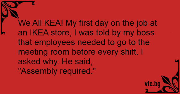 We All KEA! My first day on the job at an IKEA store, I was told by my boss that employees needed to go to the meeting room before every shift. I asked why. He said,