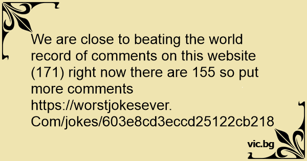 We are close to beating the world record of comments on this website (171) right now there are 155 so put more comments https://worstjokesever. Com/jokes/603e8cd3eccd25122cb21897/guys-lets-make-this-post-have-the-most-comments-on-the-whole-website