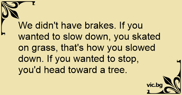 We didn't have brakes. If you wanted to slow down, you skated on grass, that's how you slowed down. If you wanted to stop, you'd head toward a tree.
