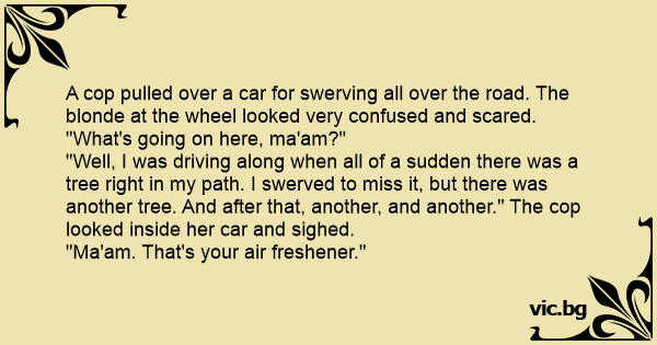 "Well, I was driving along when all of a sudden there was a tree right in my path. I swerved to miss it, but there was another tree. And after that, another, and another." The cop looked inside her car and sighed.