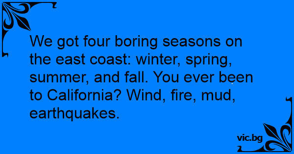 We got four boring seasons on the east coast: winter, spring, summer, and fall. You ever been to California? Wind, fire, mud, earthquakes.
