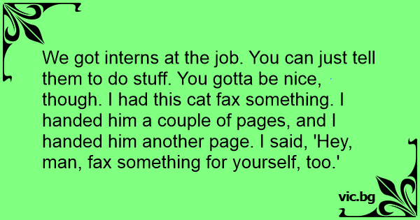 We got interns at the job. You can just tell them to do stuff. You gotta be nice, though. I had this cat fax something. I handed him a couple of pages, and I handed him another page. I said, 'Hey, man, fax something for yourself, too.'