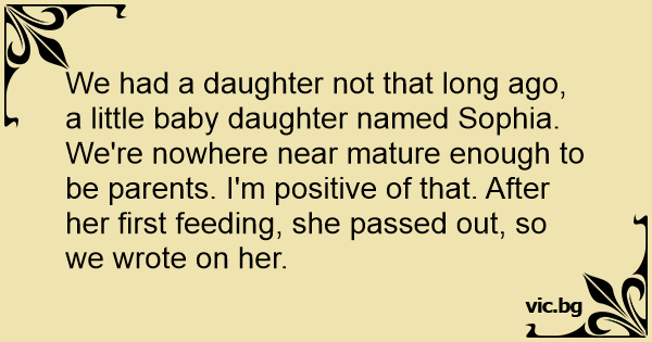 We had a daughter not that long ago, a little baby daughter named Sophia. We're nowhere near mature enough to be parents. I'm positive of that. After her first feeding, she passed out, so we wrote on her.