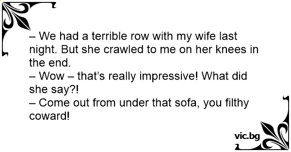 - So che hai litigato con tua moglie. Com'è finita? - Sapessi, è venuta da me in ginocchio. - Ah, si? E che cosa ha detto? - Vieni fuori da sotto il letto, vigliacco!