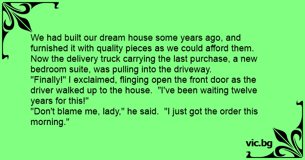 We had built our dream house some years ago, and furnished it with quality pieces as we could afford them. Now the delivery truck carrying the last purchase, a new bedroom suite, was pulling into the driveway.