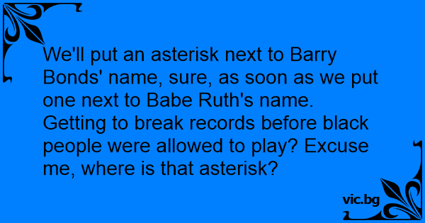 We'll put an asterisk next to Barry Bonds' name, sure, as soon as we put one next to Ваве Ruth's name. Getting to break records before black people were allowed to play? Excuse me, where is that asterisk?