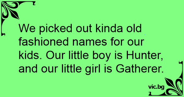 We picked out kinda old fashioned names for our kids. Our little boy is Hunter, and our little girl is Gatherer.