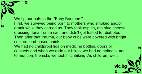 First, we survived being born to mothers who smoked and/or drank while they carried us. They took aspirin, ate blue cheese dressing, tuna from a can, and didn't get tested for diabetes.