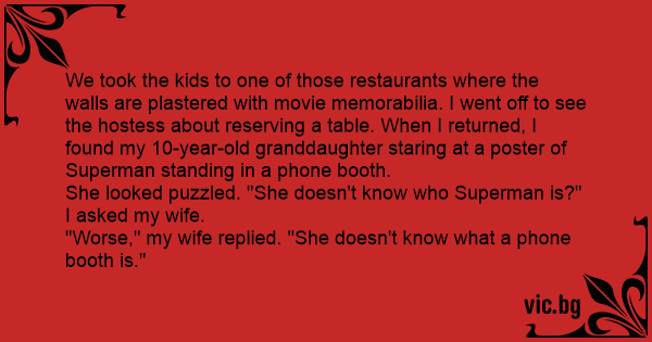 "Worse," my wife replied. "She doesn't know what a phone booth is."