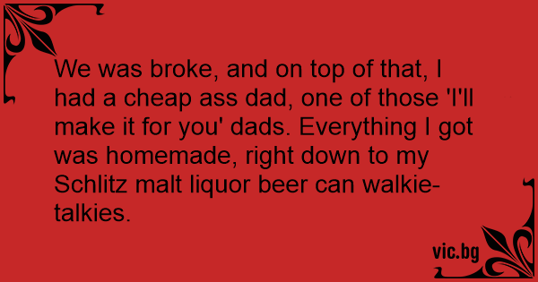 We was broke, and on top of that, I had a cheap аss dad, one of those 'I'll make it for you' dads. Everything I got was homemade, right down to my Schlitz malt liquor вееr can walkie-talkies.