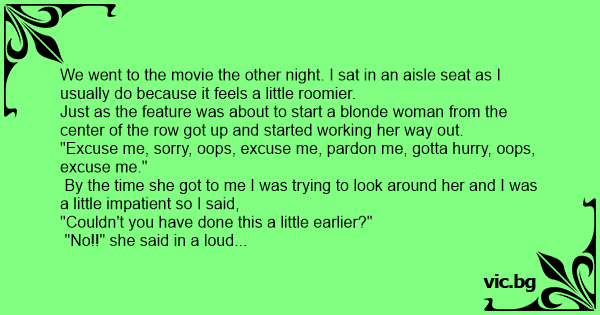 We went to the movie the other night. I sat in an aisle seat as I usually do because it feels a little roomier.