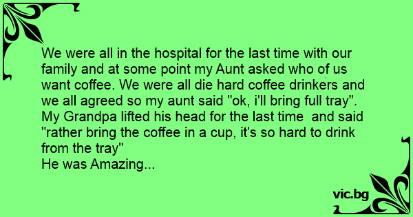 We were all in the hospital for the last time with our family and at some point my Aunt asked who of us want coffee. We were all die hard coffee drinkers and we all agreed so my aunt said "ok, i'll bring full tray".