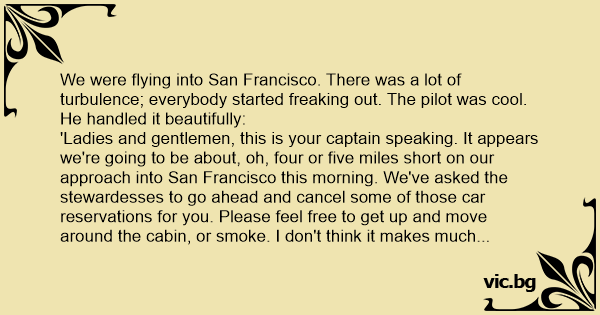 'Ladies and gentlemen, this is your captain speaking. It appears we're going to be about, oh, four or five miles short on our approach into San Francisco this morning. We've asked the stewardesses to go ahead and cancel some of those car reservations for you. Please feel free to get up and move around the cabin, or smoke. I don't think it makes much difference at this point. You people on the right are going to get a real nice view of the bay coming up there pretty quick. People on the left are going to get a pretty good view of the people on the right. By the way, for you swimmers on board, the water temperature is a brisk 63 degrees. Those of you who don't swim, thanks for flying the United way.'