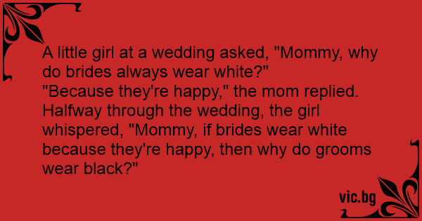 "Because they're happy," the mom replied. Halfway through the wedding, the girl whispered, "Mommy, if brides wear white because they're happy, then why do grooms wear black?"
