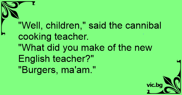"Well, children," said the cannibal cooking teacher. "What did you make of the new English teacher?" "Burgers, ma'am."