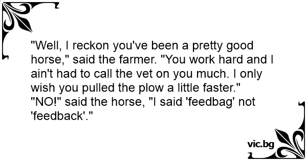 "NO!" said the horse, "I said 'feedbag' not 'feedback'."