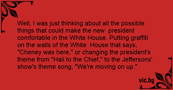 Well, I was just thinking about all the possible things that could make the new president comfortable in the White House. Putting graffiti on the walls of the White House that says, "Cheney was here," or changing the president's theme from "Hail to the Chief," to the Jeffersons' show's theme song, "We're moving on up."