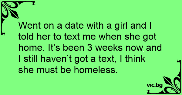 Went on a date with a girl and I told her to text me when she got home. It’s been 3 weeks now and I still haven’t got a text, I think she must be homeless.