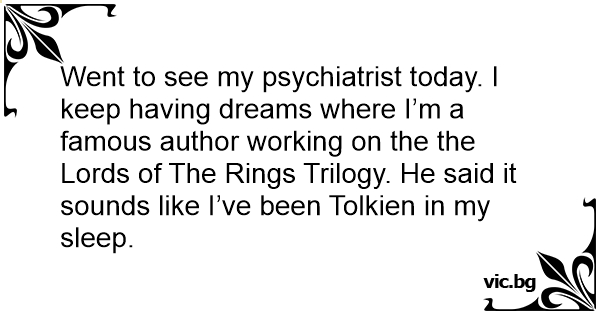 Went to see my psychiatrist today. I keep having dreams where I’m a famous author working on the the Lords of The Rings Trilogy. He said it sounds like I’ve been Tolkien in my sleep.