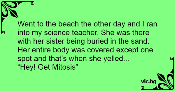 Went to the beach the other day and I ran into my science teacher. She was there with her sister being buried in the sand. Her entire body was covered except one spot and that’s when she yelled...