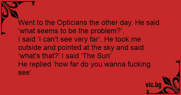 Went to the Opticians the other day. He said ‘what seems to be the problem?’.
