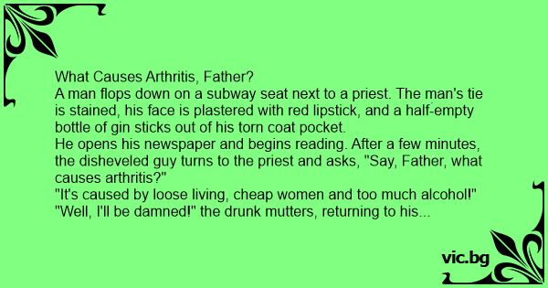 He opens his newspaper and begins reading. After a few minutes, the disheveled guy turns to the priest and asks, "Say, Father, what causes arthritis?"