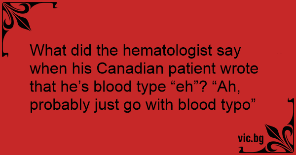 What did the hematologist say when his Canadian patient wrote that he’s blood type “eh”? “Ah, probably just go with blood typo”