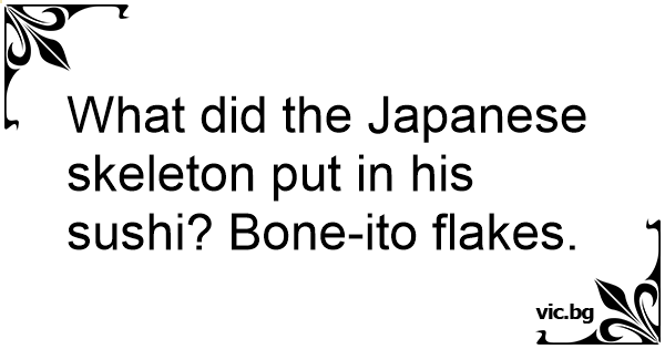 What did the Japanese skeleton put in his sushi? Воnе-ito flakes. 1 0 0 Skeleton jokes Japanese Jokes