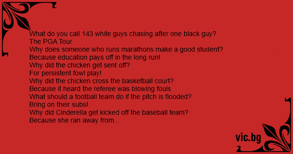What do you call 143 white guys chasing after one black guy? The PGA Tour Why does someone who runs marathons make a good student? Because education pays off in the long run! Why did the chicken get sent off? For persistent fowl play! Why did the chicken cross the basketball court? Because it heard the referee was blowing fouls What should a football team do if the pitch is flooded? Bring on their subs! Why did Cinderella get kicked off the baseball team? Because she ran away from the ball! Why Was Cinderella such a lousy baseball player? She had a pumpkin for a coach! Why did a outfielder take a piece of rope onto the field? He was the skipper! How did the football pitch end up as triangle? Somebody took a corner! Why didn’t the dog want to play football? It was a boxer! What lights up a soccer stadium? A soccer match! Why do grasshoppers not go to many football matches? They prefer cricket matches!