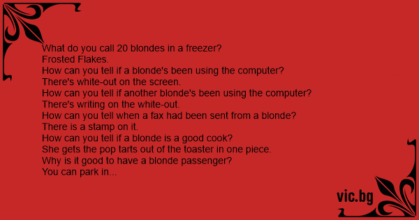 What do you call 20 blondes in a freezer? Frosted Flakes. How can you tell if a blonde's been using the computer? There's white-out on the screen. How can you tell if another blonde's been using the computer? There's writing on the white-out. How can you tell when a fax had been sent from a blonde? There is a stamp on it. How can you tell if a blonde is a good cook? She gets the pop tarts out of the toaster in one piece. Why is it good to have a blonde passenger? You can park in the handicap zone. Why should blondes not be given coffee breaks? It takes too long to retrain them.