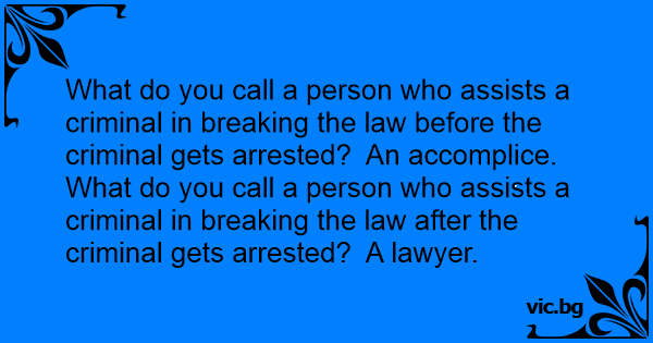 What do you call a person who assists a criminal in breaking the law before the criminal gets arrested? An accomplice. What do you call a person who assists a criminal in breaking the law after the criminal gets arrested? A lawyer.