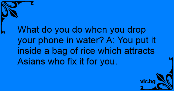 What do you do when you drop your phone in water? A: You put it inside a bag of rice which attracts Asians who fix it for you.