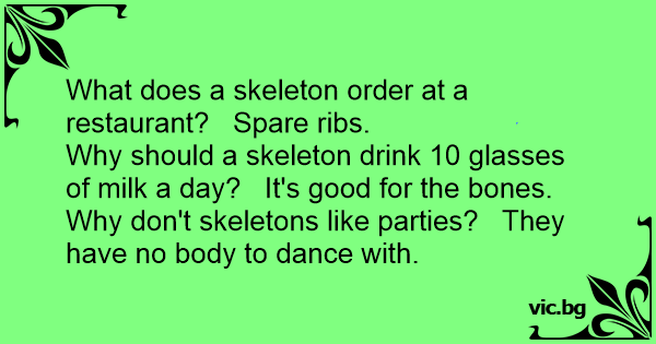 Why should a skeleton drink 10 glasses of milk a day? It's good for the bones.