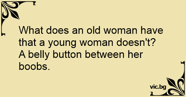 Какво има една 60 годишна жена между гърдите, което млада жена няма? - Пъп. Какво има една 80 годишна жена между гърдите, което една 60 годишна няма? - Косми