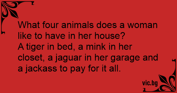 Kvinnor behöver 4 djur för att vara lycklig. En jaguar i garaget, en mink i garderoben, en hingst i sängen och en åsna som betalar allt. Mannen däremot är helt nöjd med en liten mus...